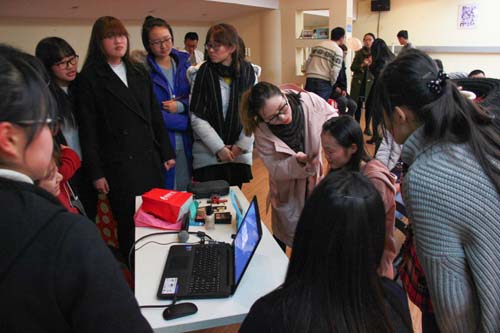 活动的第二个比较精彩的环节是“基础护肤化妆教学”。园区的工作人员特意请来了北区“优优化妆店”店主西瓜老师。在对女生护肤以及化妆品的选择进行简单介绍后,老师开始进行现场示范。如何打底,打高光、暗影、描眉等等,细致的手法与精到的讲解,令围观的女孩子们叹服。